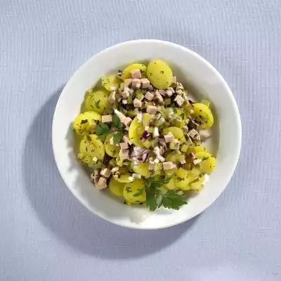 In the meantime peel and finely dice the onion. Dab gherkins dry. Finely dice sausage and gherkins. Wash parsley, dab dry, garnish all but a few leaves, pluck them from the stalks and chop roughly.