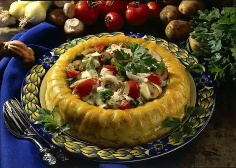 Then stir in flour, egg, fat, cheese, 1 teaspoon salt and nutmeg. Wash parsley, dab dry and chop finely, except for a little to garnish. Add to the potato dough. Pour the mixture into a greased and semolina sprinkled Savarinform (1 litre capacity) and smooth it down.