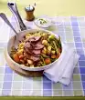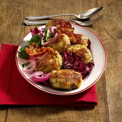 Season to taste with salt, pepper and nutmeg. With wet hands form 12 potato plantlets (meatballs). Heat clarified butter in a large pan in portions. Also fry the seedlings in portions at a lower heat, turning them over for about 8 minutes, keep warm. Cut the bacon slices in half and fry them crispy in the frying fat at high heat. Arrange the vegetable and bacon on colourful leaf salad
