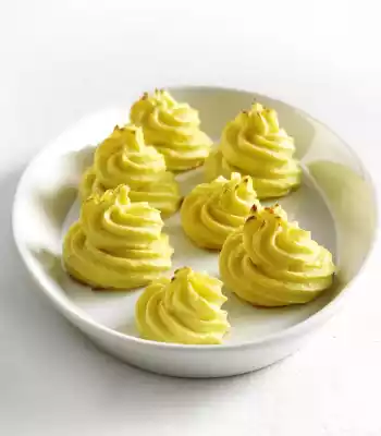 Stir in 3 egg yolks and 5 tablespoons of milk. Season to taste with salt and nutmeg. Pour into a piping bag with a large star-shaped spout and squirt about 20 duchess potatoes onto a baking tray lined with baking paper.