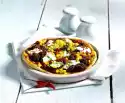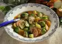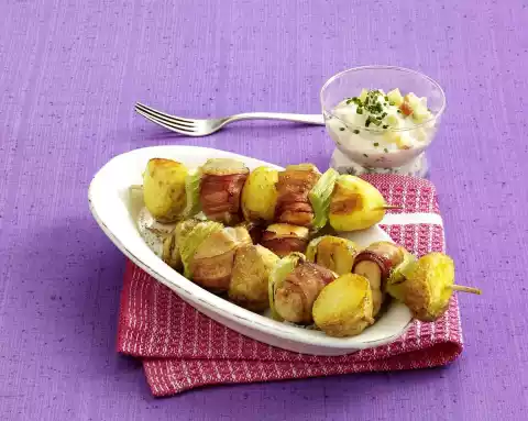 Stir in apple cubes and chives. Wash the meat, dab dry and cut into 16 pieces. Halve the bacon slices. Wrap a piece of bacon around each piece of meat. Wash and clean the celery and cut it into 16 pieces. Leave small potatoes whole, cut larger ones in half. Put potatoes, meat and celery alternately on 8 skewers. Season with salt and pepper. Heat 1 tablespoon of oil in a pan. Brown 4 skewers in it all around. Cook over medium heat for about 5 minutes, remove and keep warm. Heat 1 tablespoon of oil and fry the remaining skewers in the same way.