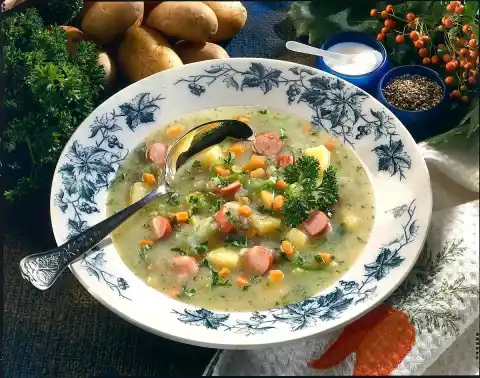 Peel, wash and chop the potatoes. Cook in boiling broth for about 15 minutes. Add soup vegetables after 5 minutes. In the meantime cut the sausages into slices. Puree half of the soup with the chopping stick.