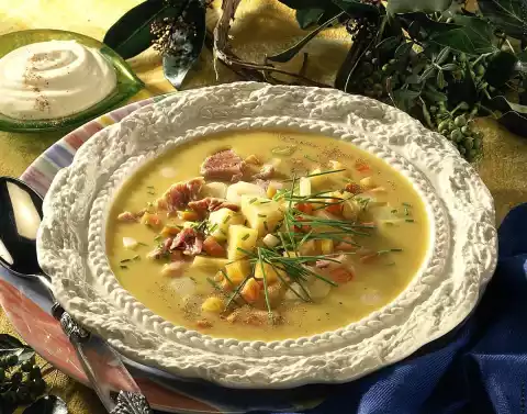 Season with salt, pepper and nutmeg. Remove the knuckle of pork from the bone and cut into small pieces. Wash the chives, cut into small pieces, the rest of the pumpkin into small pieces. Warm all ingredients in the soup, season again and serve.