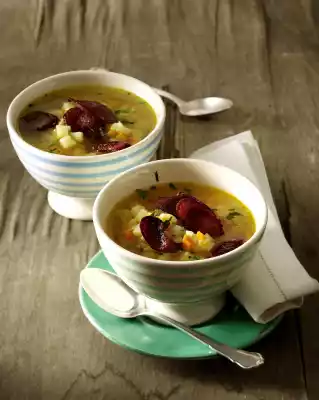 Wash parsley, shake dry and chop. Mash the soup with a potato masher so that the vegetable and potato pieces remain whole. Season to taste with salt, pepper and nutmeg. Serve the soup with Kabanossi chips and sprinkle with parsley