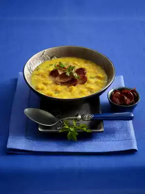 Add stock, bring to the boil and cook for about 20 minutes. Wash the coriander and chop finely, except for a little to garnish. Cut the sausage into thin slices. Heat oil in a pan. Fry the sausage for about 2 minutes, turning it over.
