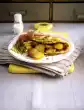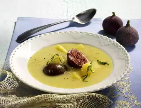 Deglaze with 1 litre of water, salt a little. Cover and simmer for about 30 minutes. Remove bacon, rosemary and 1/3 of the potato pieces. Add cream. Puree the soup. Add the potato pieces again. Season soup with salt, pepper and horseradish. Clean and halve the figs. Strip remaining rosemary needles from the stalks. Heat 1 tablespoon butter.