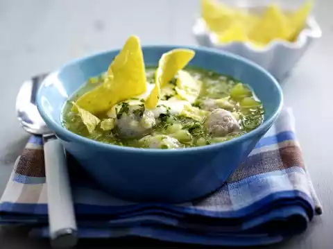 In the meantime, wash the parsley, shake dry, chop finely and stir into the soup. Season soup with salt and pepper. Serve the soup. Put 1 blob of crème fraîche on each and put some nachos in.