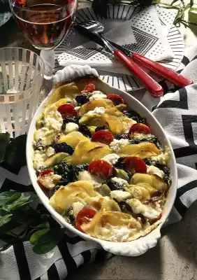 Peel and wash the potatoes and slice them into very thin slices. Clean, wash and halve the tomatoes. Layer spinach, potatoes and tomatoes in an ovenproof dish. Season with salt and pepper