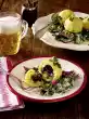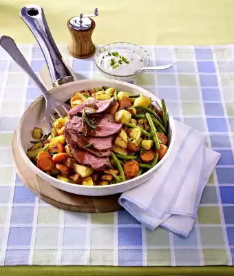 Wash the chives, shake dry and cut into small rolls. Mix sour cream and chives. Heat up the stock again. Cut meat into slices and arrange on the potato pan. Drizzle with sauce. Add Sour Cream