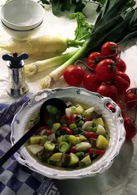 Add the potatoes to the meat 15 minutes before the end of the cooking time. Clean and wash the leek. Peel the radish and cut into quarters lengthwise. Cut both into pieces and add 10 minutes before the end of cooking time. Wash and halve the tomatoes, remove the seeds.