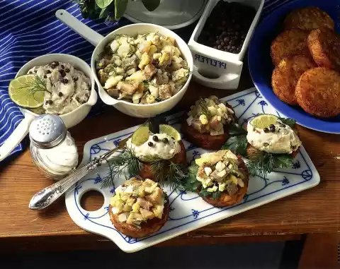 Finely dice cucumbers and maties as well. Wash and chop the dill. Mix the prepared ingredients with some lime juice. Place the Rösti-Taler on a baking tray without defrosting. Bake in a preheated oven (electric: 225 ° C/ gas: level 4) for about 12 minutes.