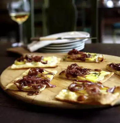 Bake in the preheated oven (electric cooker: 225 °C/ convection oven: 200 °C/ gas: level 4) for about 15 minutes. Remove the tarte flambée, cut into pieces and sprinkle with stock if necessary