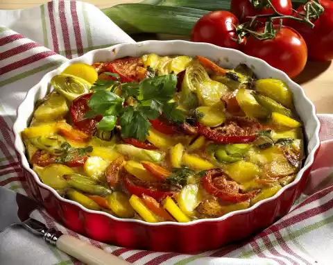 Cut the potatoes into slices. Wash herbs and shake dry. Remove the leaves. Spread Pieform (26 cm Ø) with remaining fat. Layer vegetables and potatoes in the form. Pour egg and milk over it and garnish with herbs. Bake in the preheated oven (electric cooker: 175 °C/ gas: level 2) for about 30 minutes. Serve warm