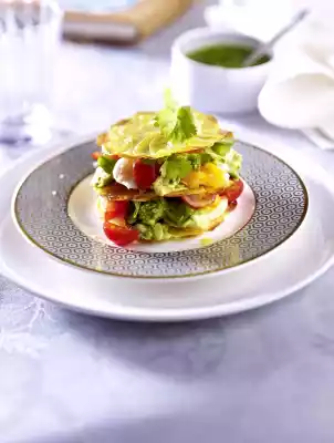 Arrange 1 potato rosette in the middle of each plate. Add some egg, avocado, paprika-tomato mixture and mojo verde to each plate. Place another potato rosette on top. Repeat the process and end with a potato rosette. Garnish with coriander. Pour the rest of the mojo verde into a glass and keep it closed in the refrigerator