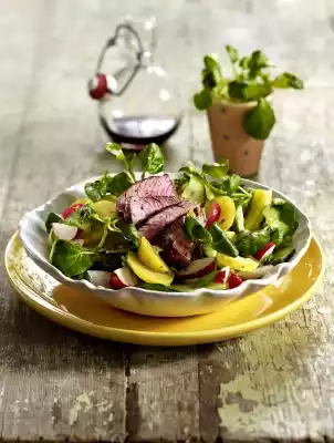 Mix radish, cucumber and watercress with the potato salad. Season to taste again. Arrange salad, sprinkle with pumpkin seed oil. Cut the steaks into slices and place on top.
