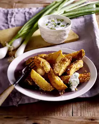 Wash potatoes thoroughly, dab dry and cut into slices. Roll the slices in sesame seeds. Clean and wash spring onions, dab dry and cut into rings. Mix quark, yoghurt and sour cream, fold in spring onions.
