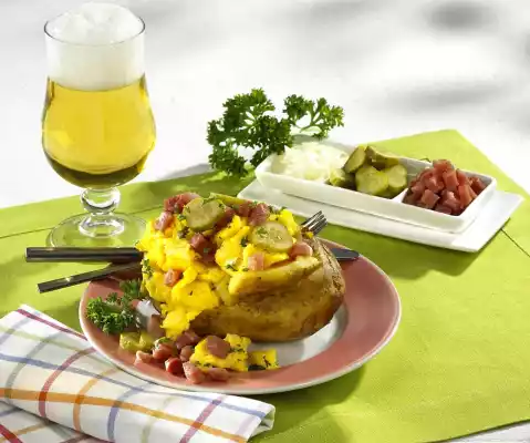 Drain the potatoes and break them open a little. Scramble eggs on the potato. Sprinkle cucumber and parsley over it
