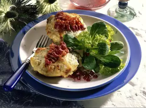 Season with cayenne pepper. Cut the potatoes in half lengthwise. Hollow out a little and add to the cream mixture. Fill the mixture into the potato halves in portions. Place bacon on top. Bake under the hot grill until golden brown.