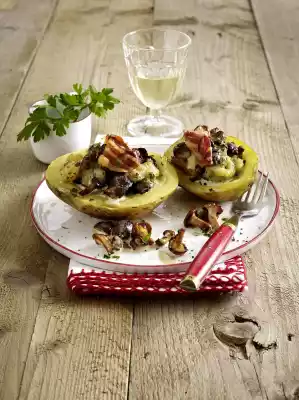 Cut the finished potatoes lengthwise in half and hollow them out. Mash the inside of the potatoes with a fork and add to the mushrooms. Spread the filling into the hollowed halves. Cut the bacon slices in half and place them on the potatoes. Bake in the preheated oven (electric cooker: 200 °C/ convection oven: 175 °C/ gas: level 3) for about 20 minutes. Arrange the finished potatoes and sprinkle with parsley