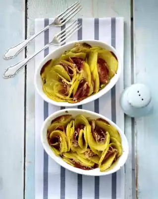 Grate cheese. Divide the potatoes and ham into 4 ovenproof moulds (each containing approx. 300 ml). Sprinkle cheese on top. Place the moulds on the oven rack, cover with aluminium foil and bake in the preheated oven (electric range: 175 °C/ convection oven: 150 °C/ gas: level 2) for approx. 50 minutes.
