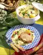 Add mushroom sausage mixture and peas and simmer for 5 minutes at low heat. Grate cheese and stir in. Season to taste with salt and pepper. Drain potatoes and cut them in half lengthwise. Brush the potato halves with the different mixtures, place them on an oiled baking tray and bake in the preheated oven (electric cooker: 200 °C/ gas: level 3) for about 15 minutes. Serve with green salad with oil-lemon vinaigrette