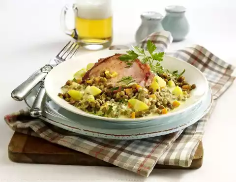 Add the lentils, bring to the boil and cook for 10 minutes. Add meat and cook for another 3 minutes. Remove the meat. Mix cream with curry, stir into the lentils and bring to the boil briefly. Season to taste with salt and pepper. Wash parsley, shake dry and, except for something to garnish, chop and stir in. Arrange creamed lentils and smoked pork loin on plates and garnish with parsley.