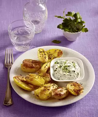 Quark, 1-2 tablespoons lemon juice, mineral water, herbs, except for something to sprinkle, mix and season with salt and pepper. Arrange potatoes and quark