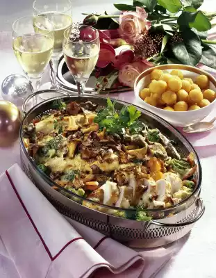 Pour the vegetables into a greased casserole dish (approx. 30 cm long). Place the fillets in it. Spread sauce over them. Bake in the preheated oven (electric cooker: 175 °C/ convection oven: 150 °C/gas: level 2) for approx. 30 minutes. Cut the meat open, garnish if necessary. Goes well with potato balls