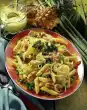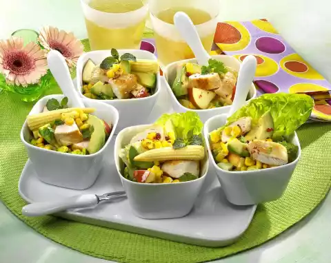 Wash and chop the herbs. Mix with vinegar and 6 tablespoons of oil. Season with salt, pepper and sugar. Cut the chicken filet into pieces. Mix with remaining salad ingredients and the marinade. Serve portion by portion garnished with corn on the cob and fresh herbs