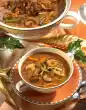 Clean and wash the mushrooms. For the dough, mix flour, baking powder, eggs, oil and 1/4 litre water to a smooth dough. Season with salt and cayenne pepper. Heat the frying fat. Pull the meat and vegetables through the dough, let them drip off a little and deep-fry in the hot fat. Serve everything garnished with fresh herbs and fruits as desired