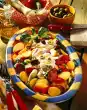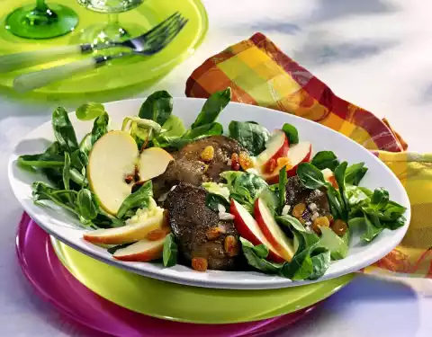 Peel and finely chop the onion. Mix with raisins, vinegar and honey and season with salt and pepper. Add the remaining oil and fold it in. Mix salad ingredients and vinaigrette. Arrange on a plate together with the liver.