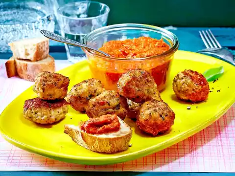 Form approx. 36 balls from the mass. Heat 4 tablespoons of oil bit by bit and fry the balls in it in portions for about 6 minutes. Arrange the balls with the dip. Baguette tastes good with it.