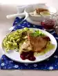 Roll it up and pin it down. Heat the oil in a deep frying pan with lid. Brown the rolls in it all around. Add the rest of the almonds. 1⁄4 l Pour on water, cream and sherry. Add 50 g plum puree, bring to the boil, cover and stew for about 15 minutes.