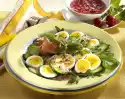 Deglaze vegetables with just under 3/8 l water, stir in stock. Wash, pluck and add the thyme. Add peas without defrosting and bring to the boil. Thicken slightly with sauce thickener and refine with sour cream. Heat meat in vegetables, season again. Drain and add the pasta