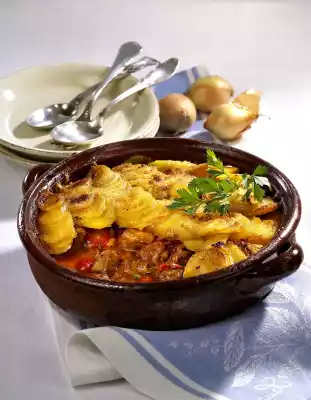 Season potatoes and sprinkle with breadcrumbs. Spread butter in flakes on top. Bake everything open for another 20-30 minutes until golden brown. Garnish