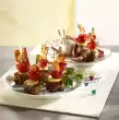 Take out the roasters. Mix the tomatoes and peppers into the goulash. Season with pepper and little salt. Put potatoes on top of the goulash like roof tiles. Pour cream over them. Cover the goulash and braise at the same temperature for about 1 3/4 hours.
