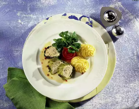 Wash the savoy cabbage leaves. Cut the stalk very flat. Blanch briefly in boiling water, drain. Finely dice unroasted chicken meat. Puree meat cubes and liver to a farce. Add cream and season with salt and pepper. Brush chicken breasts with the farce. Place 2 on top of each other and wrap with savoy cabbage. Stick them with wooden skewers or wrap kitchen string around them. Grease an ovenproof dish. Put chick packs inside. Cover and cook in the preheated oven (electric cooker: 200 °C/ gas: level 3) for about 10 minutes. Deglaze with stock and cook in the open pan for another 5 minutes. Season with crushed pink berries.