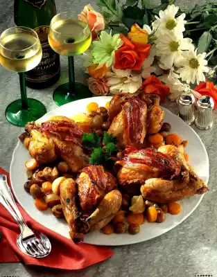 Place the chicks on the vegetables with the breast side facing upwards. Braise in the preheated oven (electric: 200°C/ gas: level 3) for about 50 minutes in an open roaster. Pour in the remaining stock and ladle the chicks.