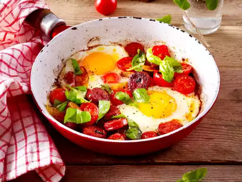 Add half onions and half chorizo and sauté for about 2 minutes, turning vigorously. Add tomatoes and beat 2 eggs in each pan. Fry over medium heat for about 4 minutes.