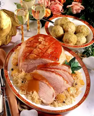 Bring to the boil again. Refine with cream, season with salt and pepper. Arrange sauerkraut and Prager ham on a plate. Pour some sauce over it. Garnish with bay leaves and parsley.