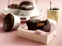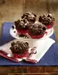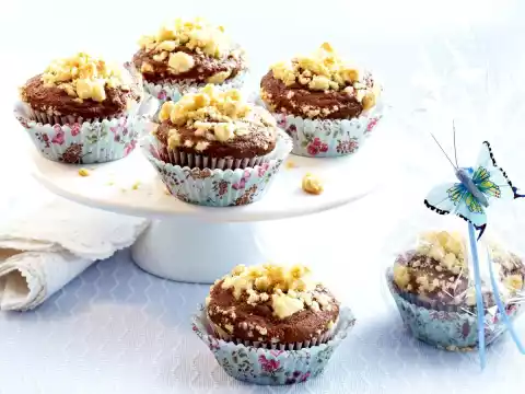 Meanwhile mix 250 g flour, cocoa, 125 g sugar, baking powder and baking soda in a bowl. Put the egg, oil and milk into a high mixing bowl and mix with the whisk of the hand mixer. Stir the milk mixture with the whisk of the hand mixer into the flour-cocoa mixture. Line the hollows of a muffin tray (12 hollows) with baking cups. Spread the dough evenly in them. Place one ball of hazelnut pastry in each centre of the trough. Sprinkle the crumbles evenly over them. Bake in the preheated oven (electric range: 175 °C/ convection oven: 150 °C/ gas: level 2) on the middle shelf for about 20 minutes.