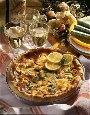 Bake the quiche in a preheated oven (electric cooker: 200 °C/ convection oven: 175 °C / gas: level 3) for about 45 minutes. Wash dill and chop if necessary. Sprinkle quiche with dill. Garnish with some lemon slices if necessary