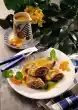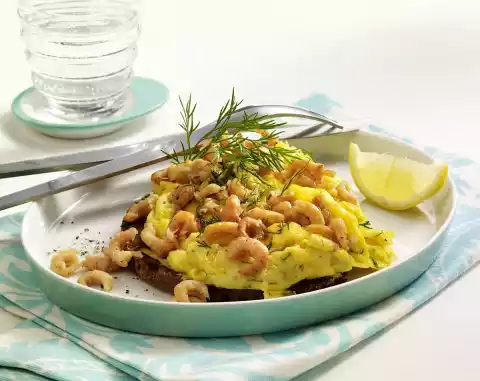 Add the egg to the pan. Add the prawns and push the egg together with the prawns. Add the scrambled eggs to the bread. Arrange on a plate and garnish with dill and lemon