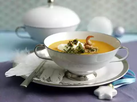 Whip the cream until semi-firm. Stir in the gin. Warm the prawns in the soup briefly. Serve soup with gin cream and dill pesto.