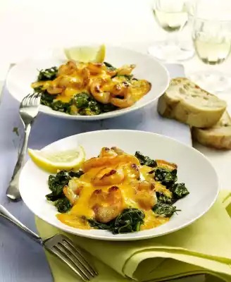 Season with salt, pepper and nutmeg. Pour prawns onto a sieve, drain and pat dry. Heat 20 g fat in a large frying pan and fry the prawns for approx. 5 minutes while turning. Season with salt and pepper. Heat 25 g fat in a saucepan, sauté the flour in it while stirring. Stir in tomato paste, add milk and cream while stirring. Bring sauce to the boil and simmer for about 3 minutes while stirring. Season to taste with salt, cayenne pepper, Worchester sauce and lemon juice. Divide the spinach into 4 greased, ovenproof dishes. Arrange prawns and sauce on top and grill under the preheated grill for about 5 minutes.