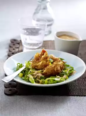 Heat the oil in a high pot to approx. 170 °C and fry the prawns in it in portions for approx. 4 minutes until golden brown. Take them out and let them drip off on kitchen paper. Mix ketchup, mayonnaise, orange juice and Worcestershire sauce, season with salt and pepper. Mix salad and paprika cubes and fill into 4 glasses. Place glasses on plates and serve with prawns and cocktail sauce