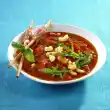 If necessary, wash the shrimps, cut lengthwise at the back and pull out the black intestine. Add the prawns to the marinade. Leave to marinate for at least 30 minutes. Remove and pat dry. Halve the bacon and wrap around the prawns