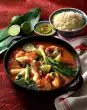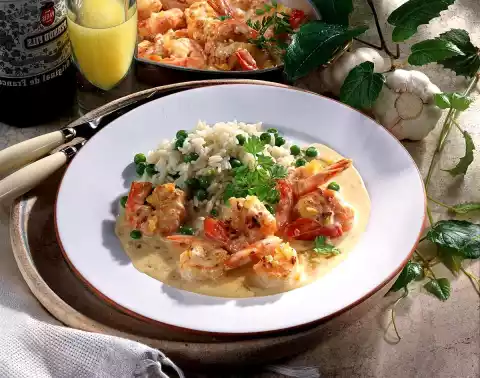 Add onions and garlic and fry briefly. Season with salt and pepper. Deglaze with Pernod, stock and cream. Simmer the prawns in the sauce for about 1 minute, stir in the sauce thickener and bring to the boil again. Season sauce with salt, pepper and lemon juice. Arrange on plates with the vegetable rice and serve garnished with chervil