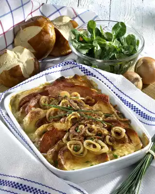 Season to taste with salt, pepper and nutmeg. Cut the bread roll into slices. Halve the meat loaf slices once. Alternate slices of bread with the meat loaf in an ovenproof dish. Pour the sauce over it.