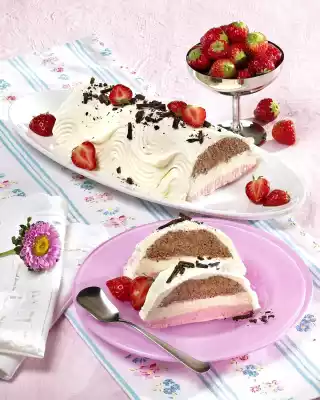 Stir the strawberry puree into the rest of the cream and spread it on the vanilla layer. Let the cream ice cream freeze overnight. Wash, clean and halve 50 g strawberries. Hold the box mould briefly in hot water and turn the ice cream out onto a plate. Whip 100 g cream until stiff, spread the ice cream with it and pass it through with a cake comb. Serve decorated with crumbled bark chocolate and strawberries
